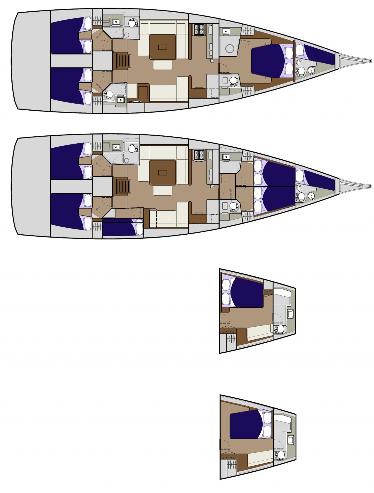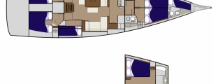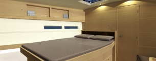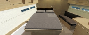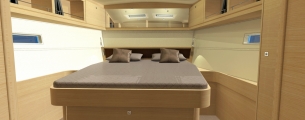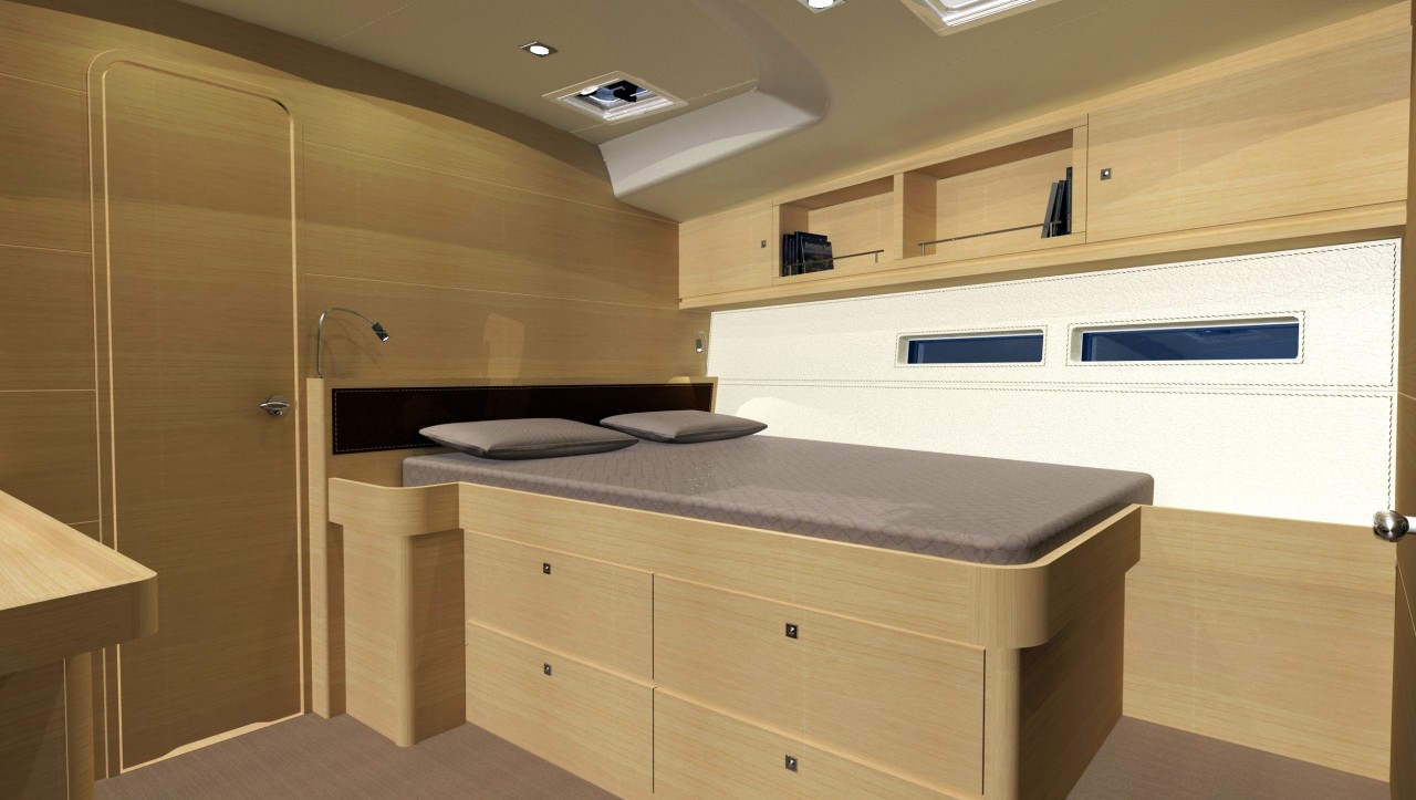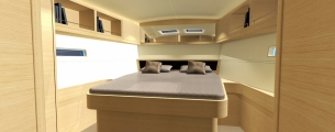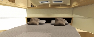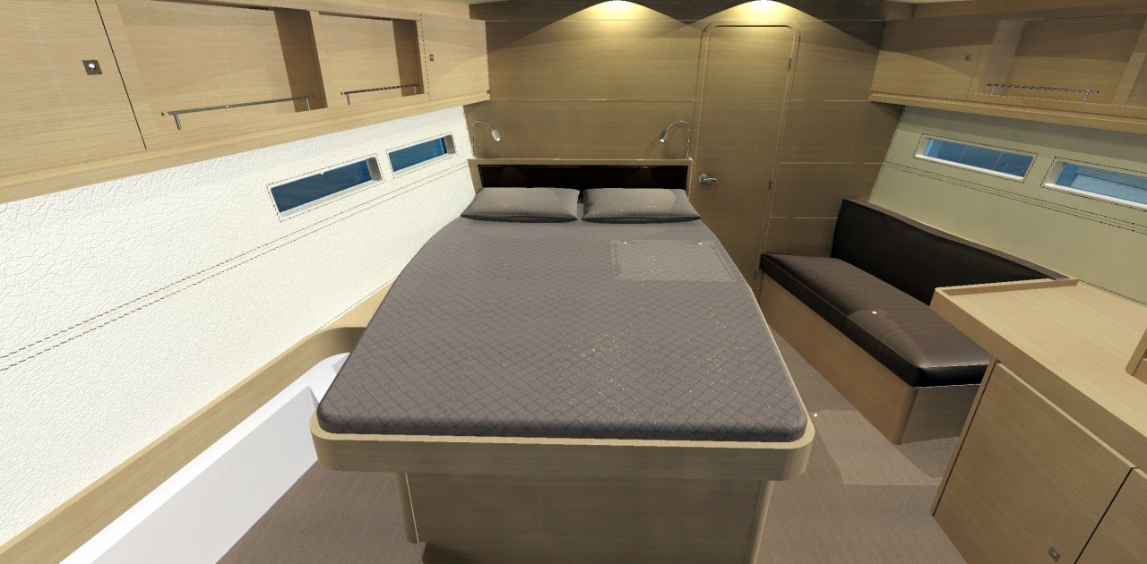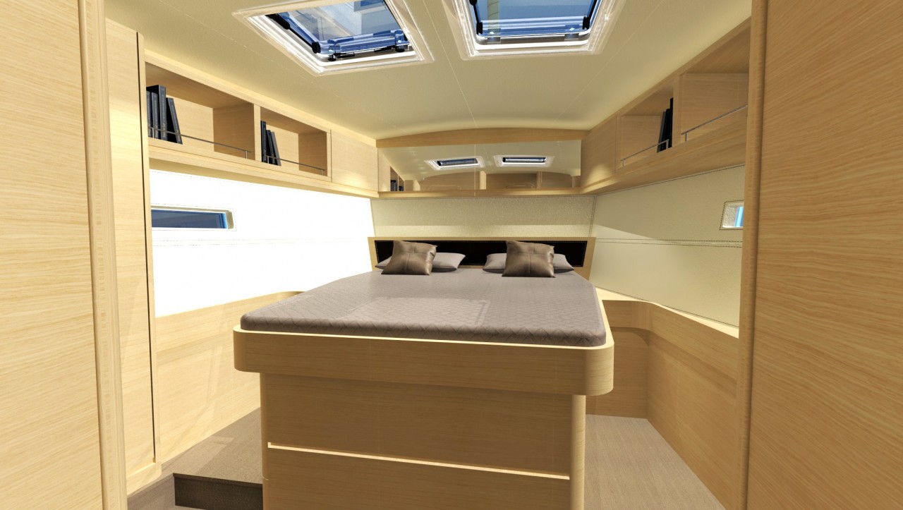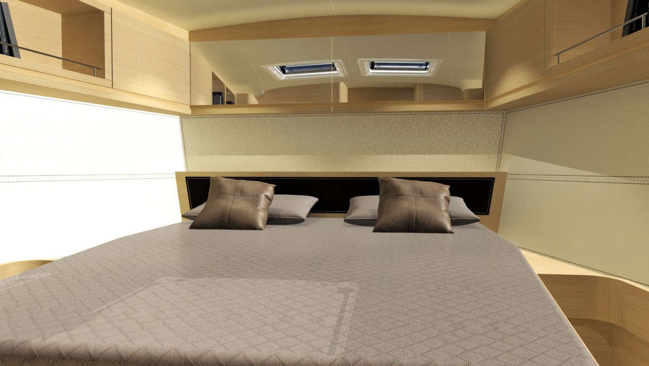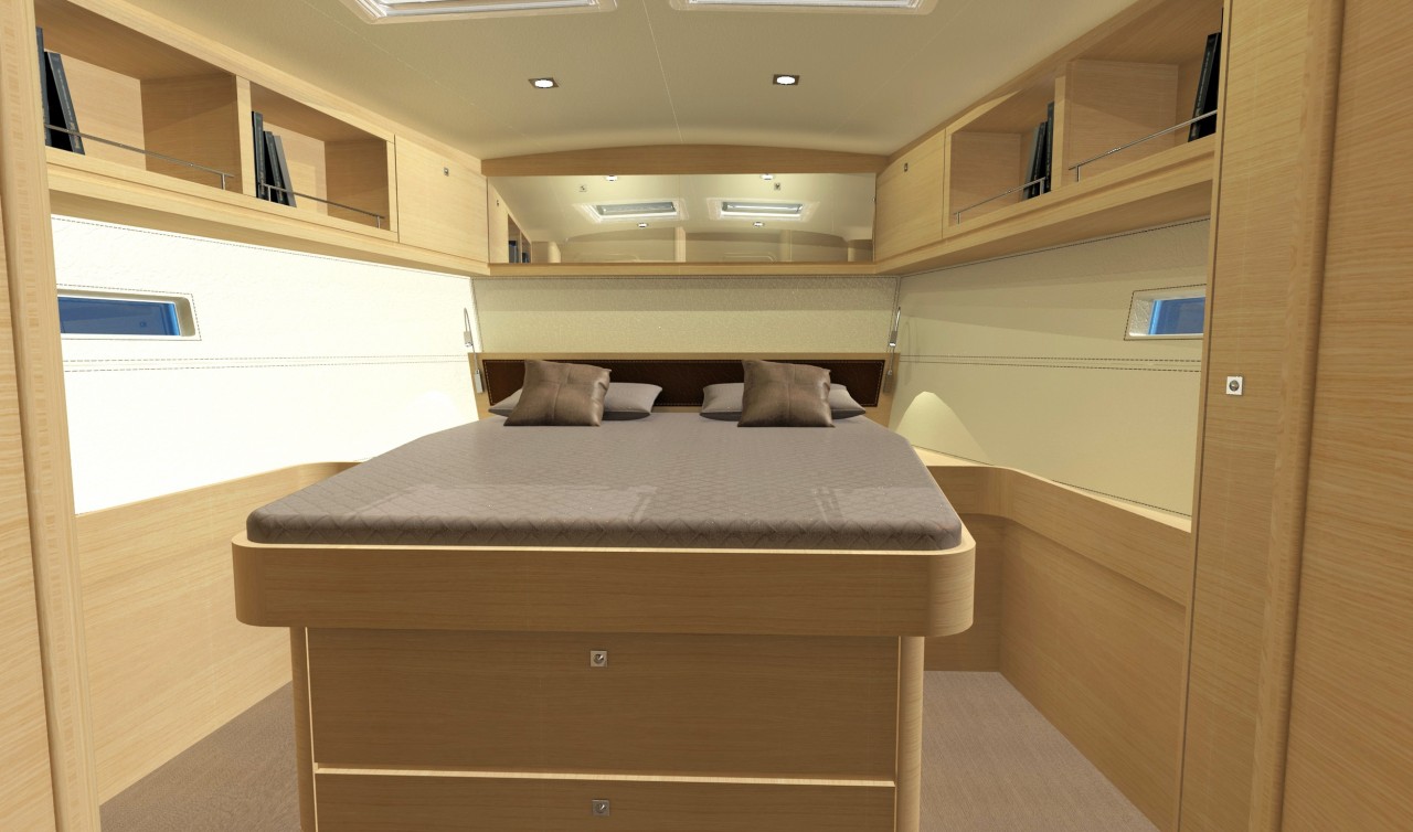 Pod pokładem jacht oferuje kilka konfiguracji rozkładu kabin, od 3-kabinowego layoutu właścicielskiego (w różnych konfiguracjach ustawienia kabiny ownerskiej) po 5 kabin + kabina skippera. Bardzo ciekawym rozwiązaniem jest przeniesienie części kambuzowej w głąb jachtu (z podziałem na część kuchenną i barową) co pozwoliło jeszcze lepiej zarządzić przestrzenią przeznaczoną na główny salon. Wnętrze jachtu a w szczególności potężny salon jest doskonale doświetlone dużą ilością panoramicznych okien.