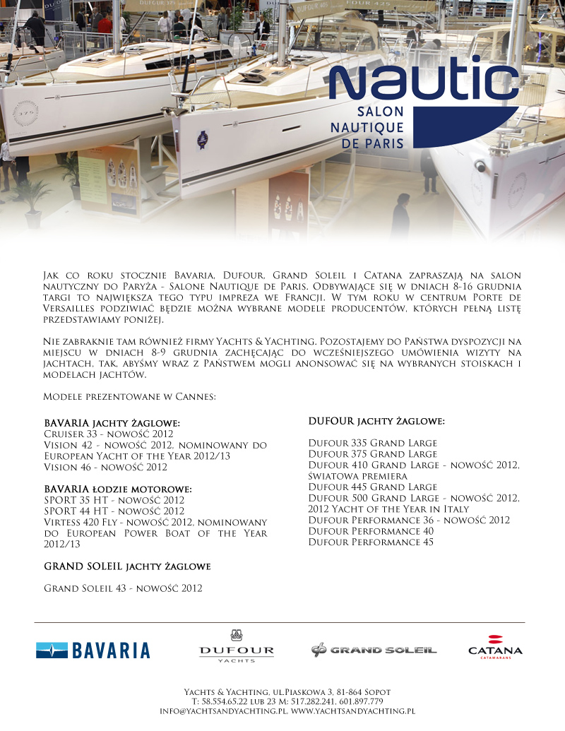 Zapraszamy na Salon Nautique de Paris w dniach 8-9 grudnia gdzie wraz z Państwem będziemy mogli się przyjrzeć nowościom ze stoczni Bavaria, Dufour, Grand Soleil i Catana.